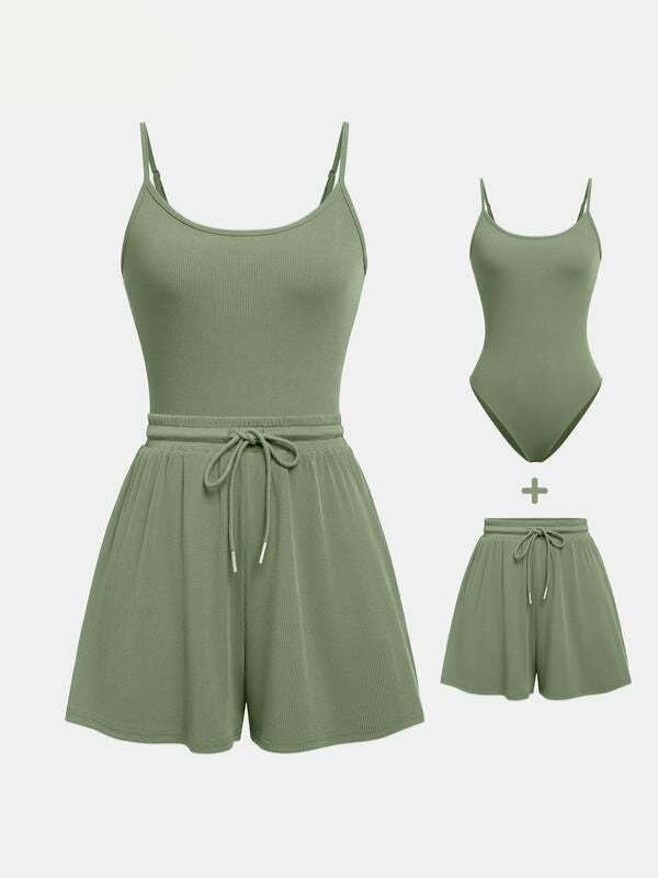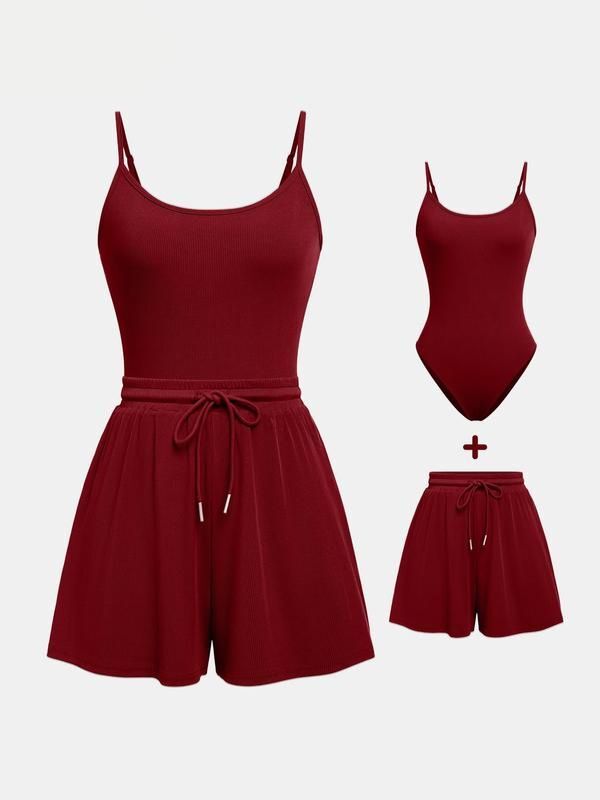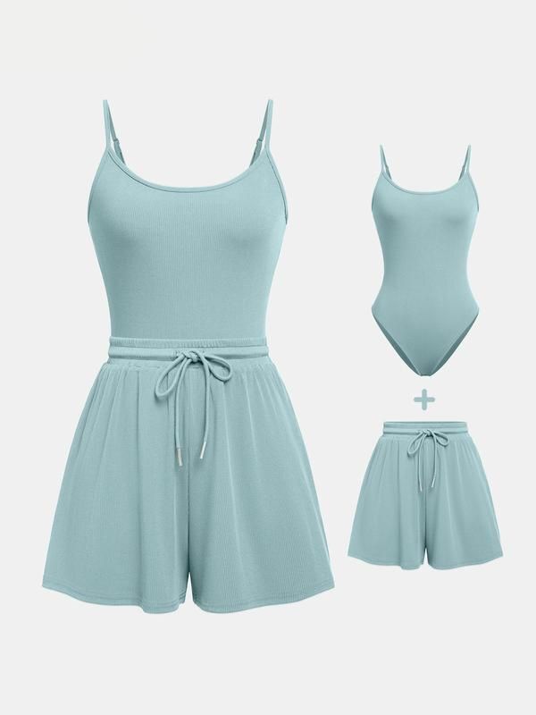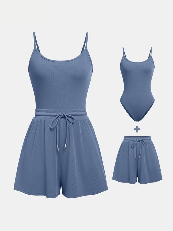 • Adjustable Strap Cami Bodysuit & Drawstring Wide Leg Shorts Set, Casual Round Neck Sphaghetti Strap Bodysuit & Elastic Shorts Set