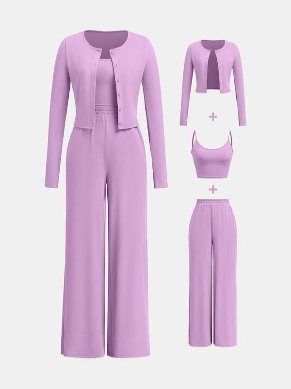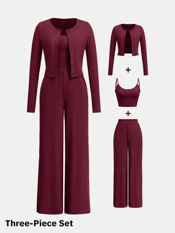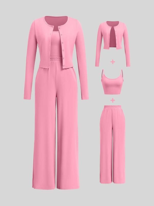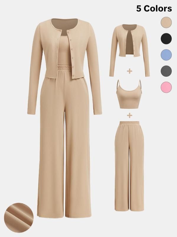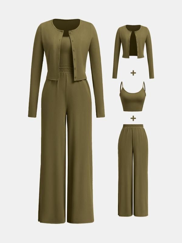 • Button Front Outerwear & Backless Crop Camisole & Elastic Waist Pants Set