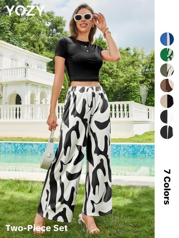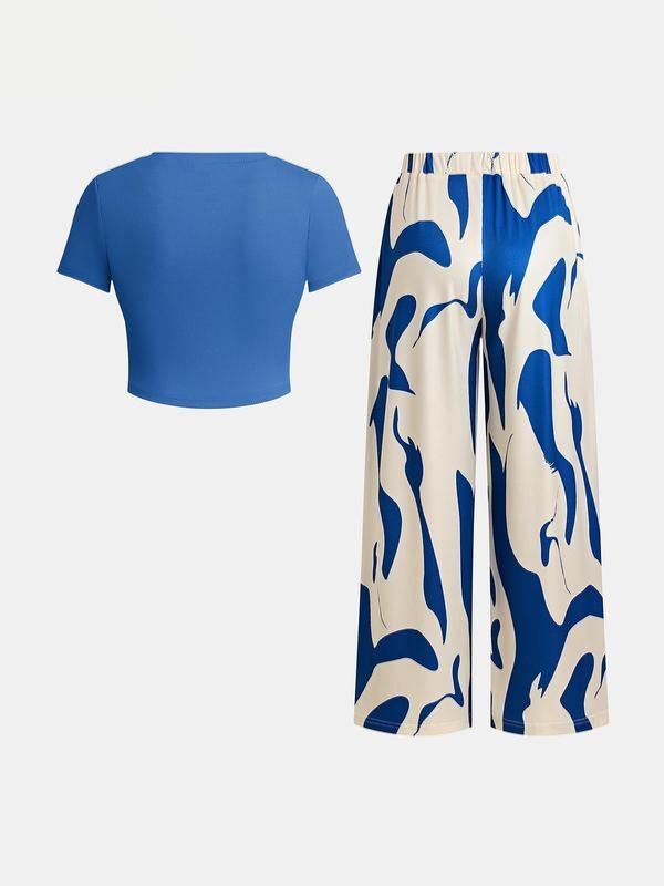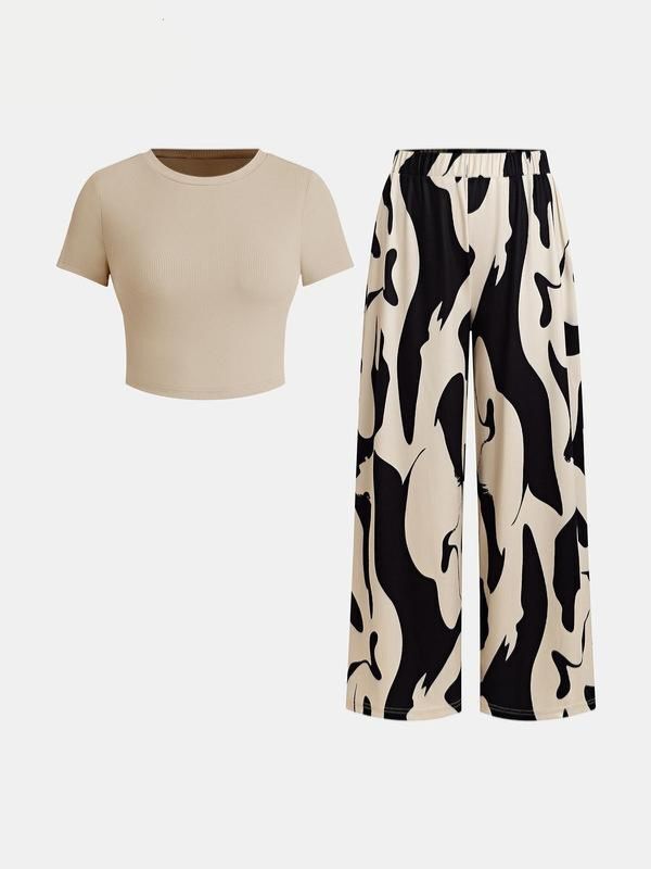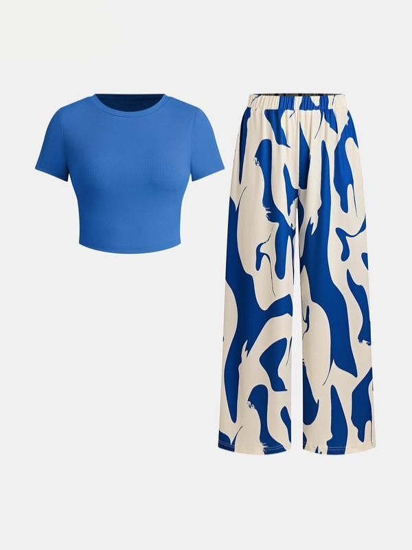• Solid Crop Top & All Over Print Pants Set, Casual Round Neck Tee & Loose Pocket Trousers