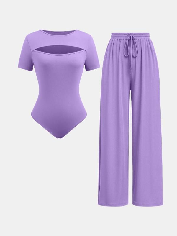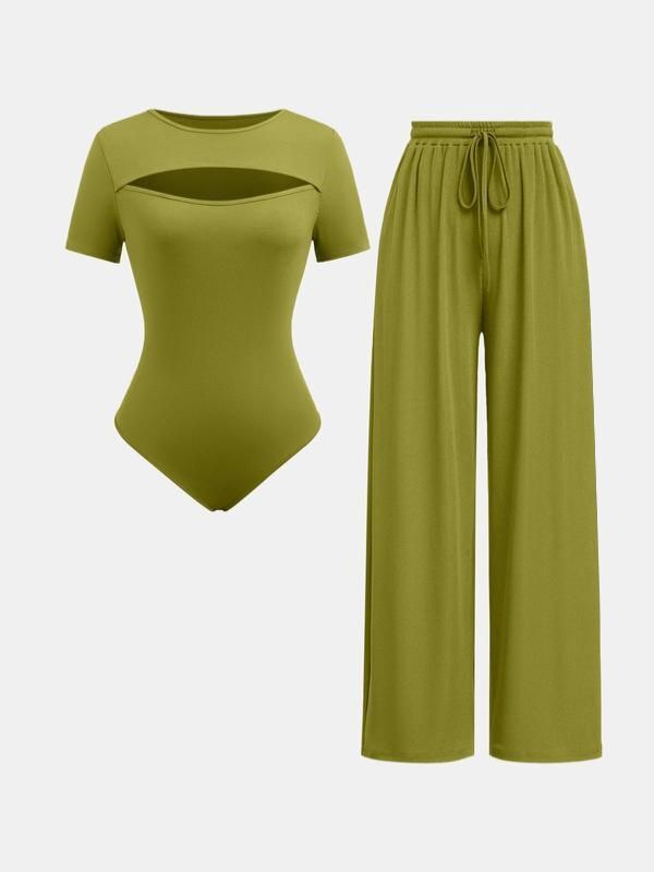• Women's Summer Outfits 2024 Solid Cut Out Short Sleeve Bodysuit & Drawstring Waist Wide Leg Pants Set