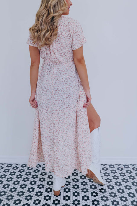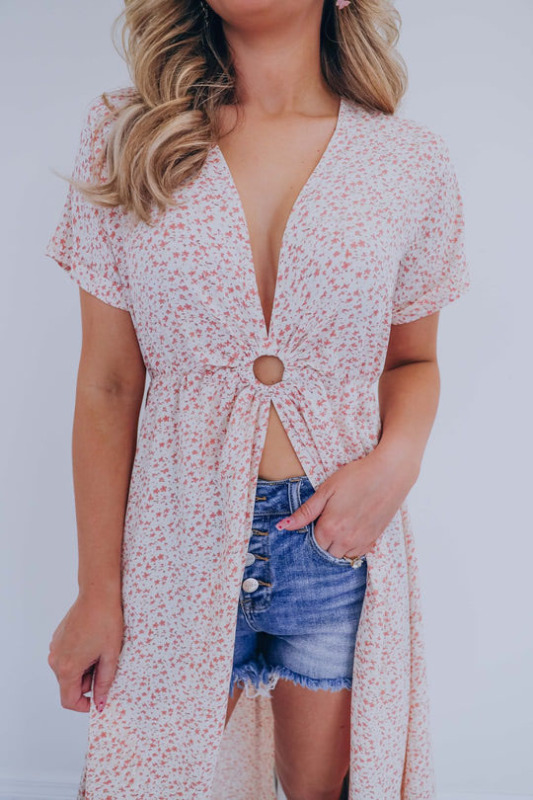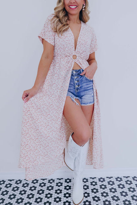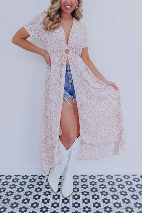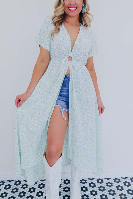 Features a floral ditsy print flowy fabric, a deep V neckline with a circle cut out at the waist, a super high front slit giving a hi low hem appearance, a surplice back with tie details, and a cuffed shsort flutter sleeve.
