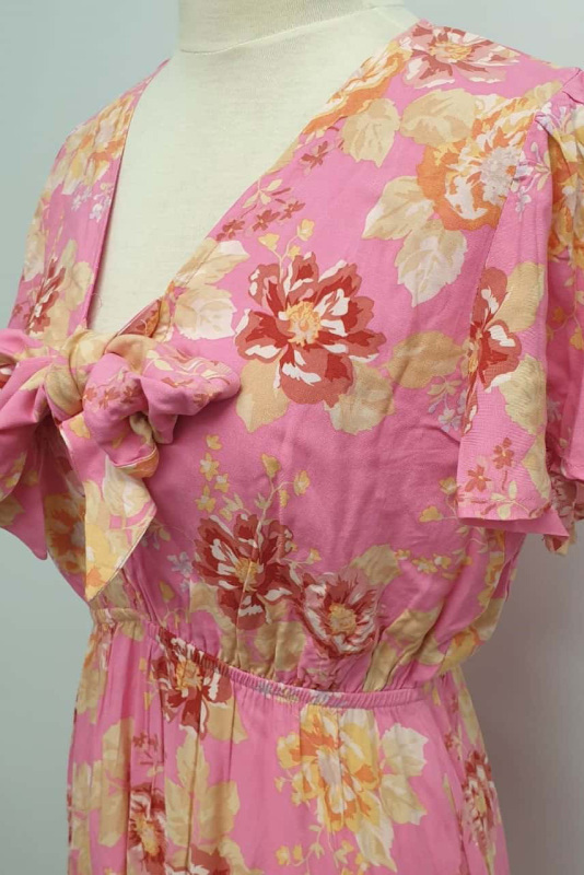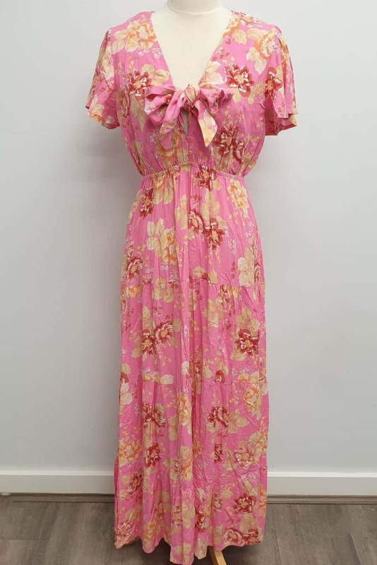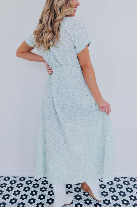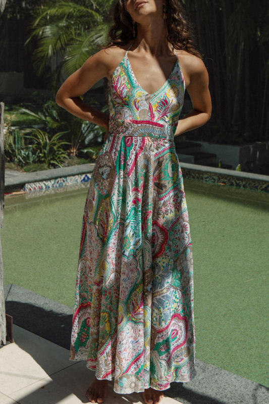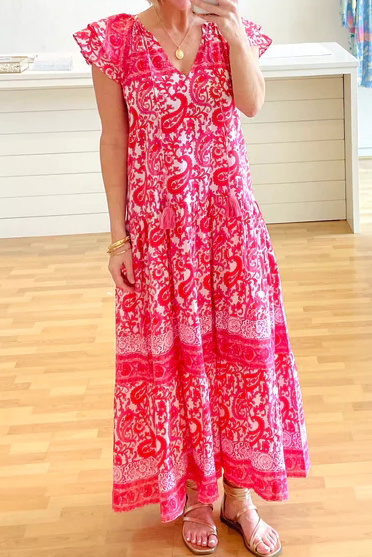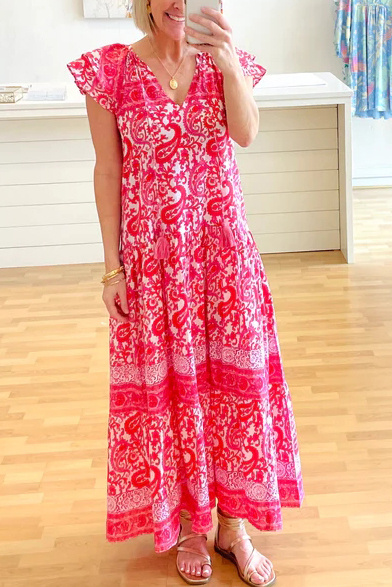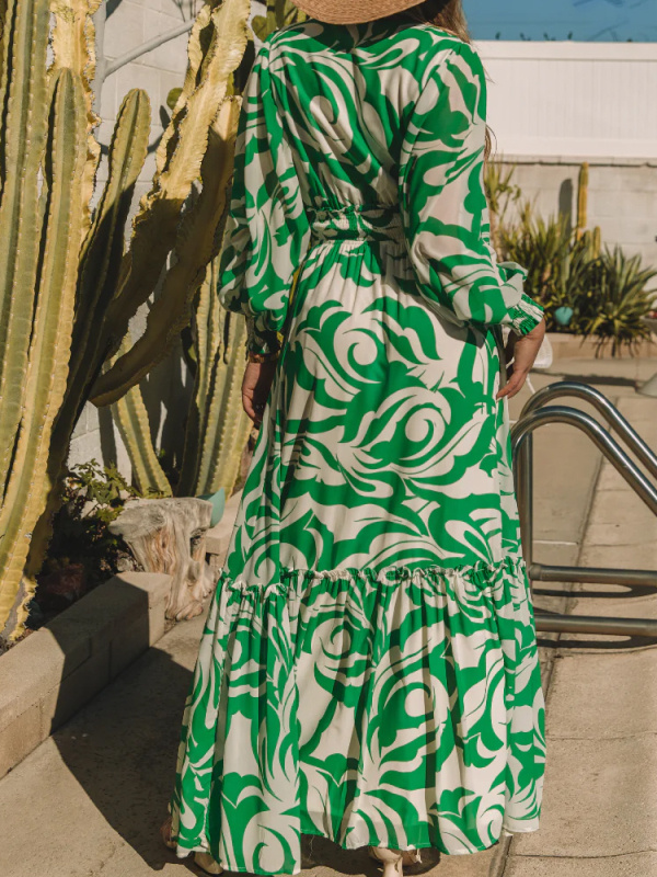 Retro court floral print V-neck lace-up short-sleeved long dress