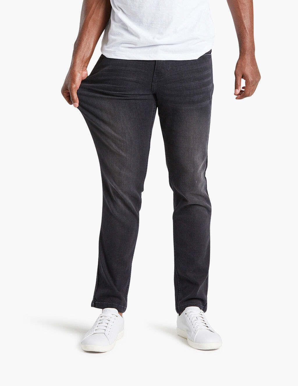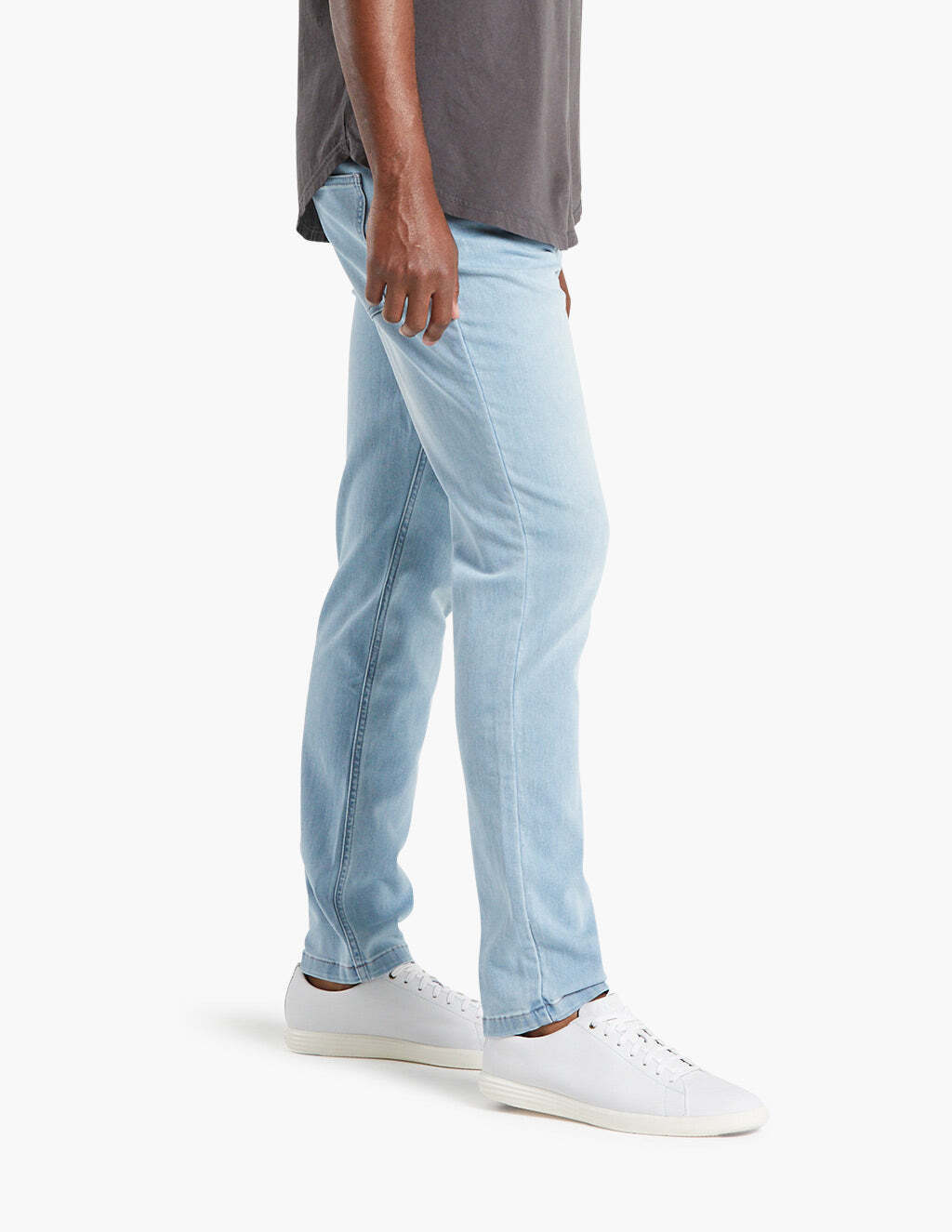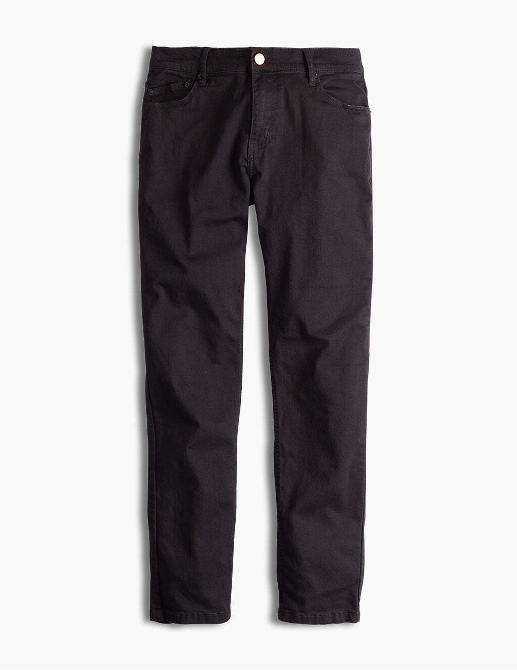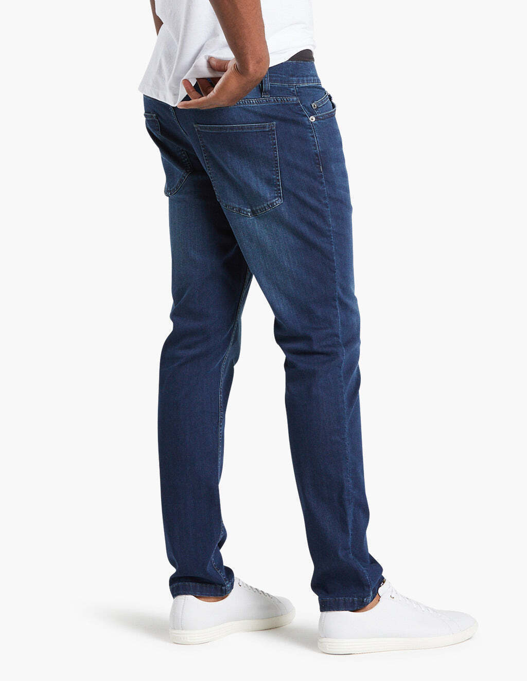 Our fit is trim, not tight, in the seat. It's relatively straight hipped with with a slight taper from the mid thigh down.